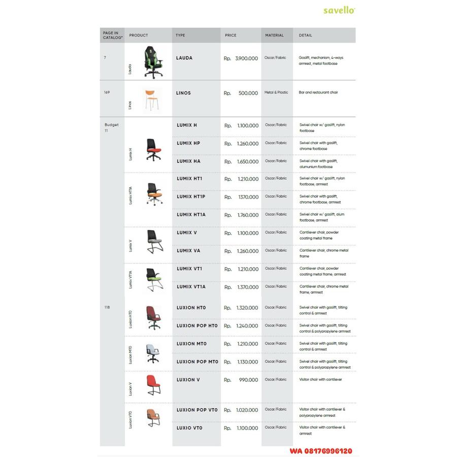 Kursi Kantor Savello LAUDA, LINOS, LUMIX H HP HA HT1 HT1P HT1A V VA VT1 VT1A, LUXION HTO POP HTO MTO POP MTO V POP VTO LUXIO VTO